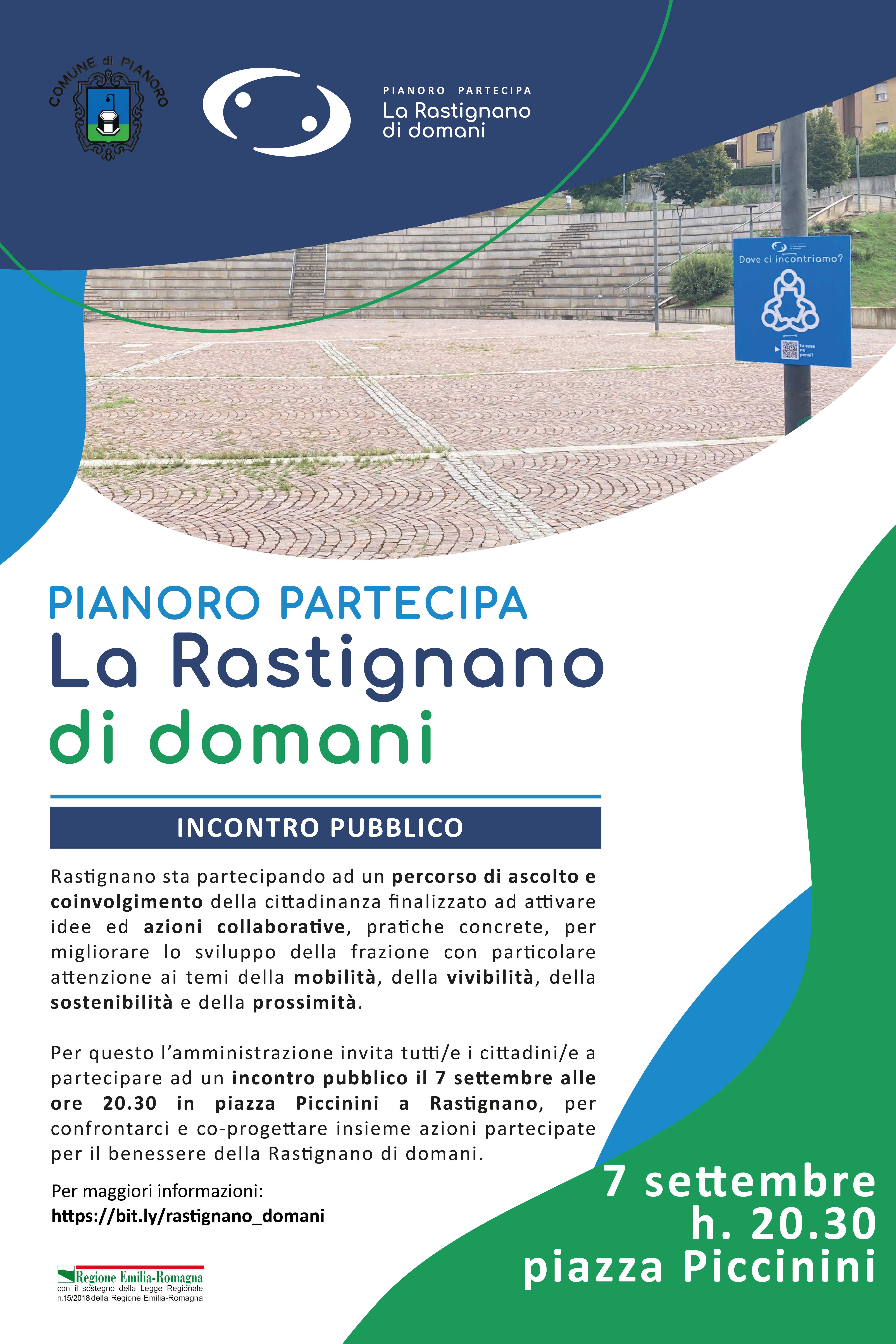 Per questo l’amministrazione invita tutti/e i cittadini/e a partecipare ad un incontro pubblico il 7 settembre alle ore 20.30 in piazza Piccinini a Rastignano, per confrontarci e co-progettare insieme azioni partecipate per il benessere dell a Rastignano di domani.