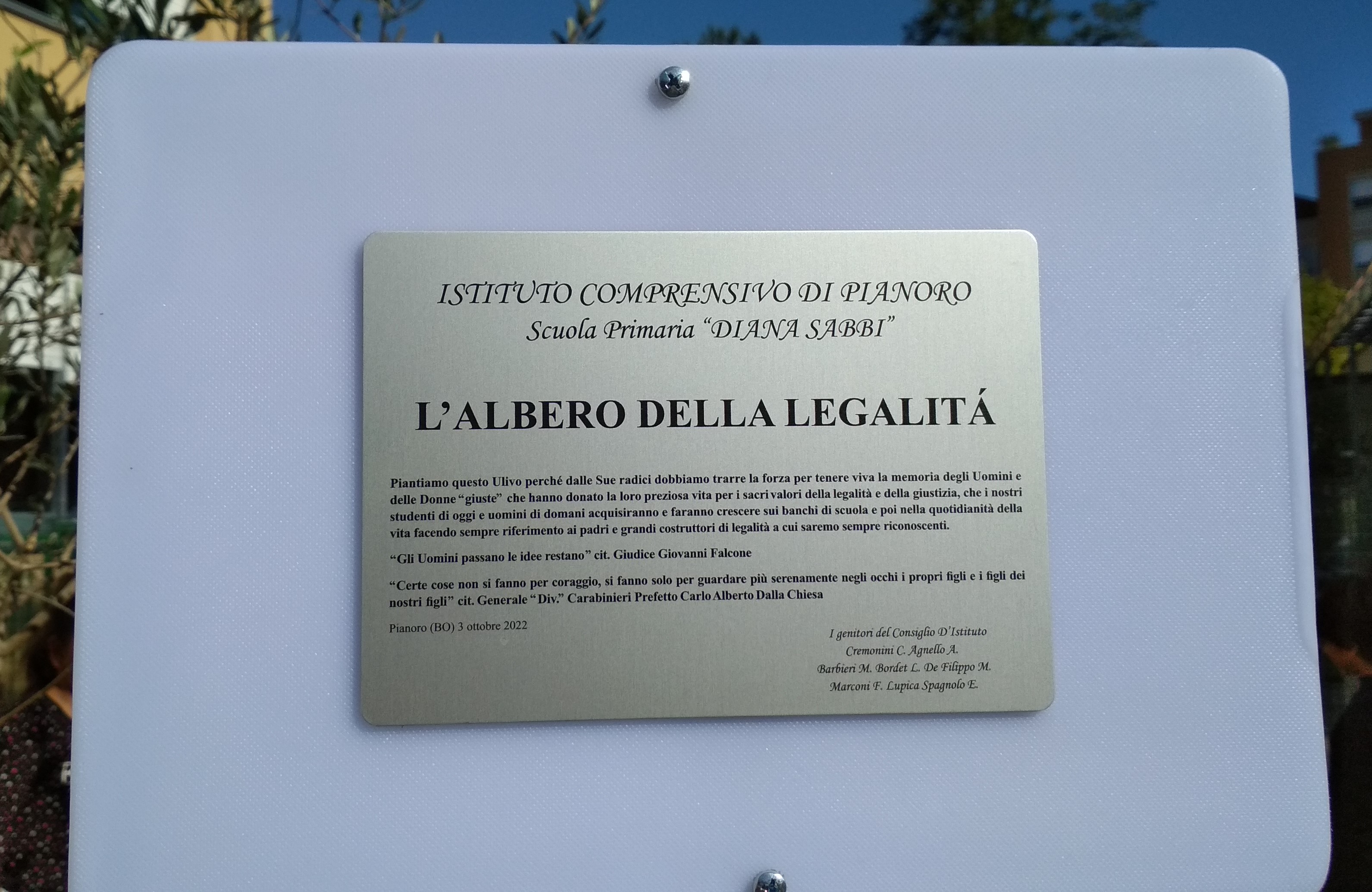 Per questo, un ringraziamento particolare va ai Genitori del Consiglio d’Istituto che hanno donato ad imperituro ricordo dell’evento, una targa commemorativa fornendo una significativa paternità alla piantumazione dell’Ulivo della legalità in quel plesso. Un evento rilevante per contribuire a stimolare e promuovere la cultura della legalità e trasmettere un messaggio di riflessione e di vicinanza ai ragazzi, che riteniamo essenziale e significativo. Anche se non presente per motivi istituzionali, abbiamo avuto la viva percezione del calore, dell’umanità e del sentimento che per il tramite dei suoi collaboratori ci ha trasmesso in questa magnifica giornata il questore di Bologna, la dottoressa Isabella Fusiello a cui va il nostro più sentito e appassionato ringraziamento. Grazie Questore!