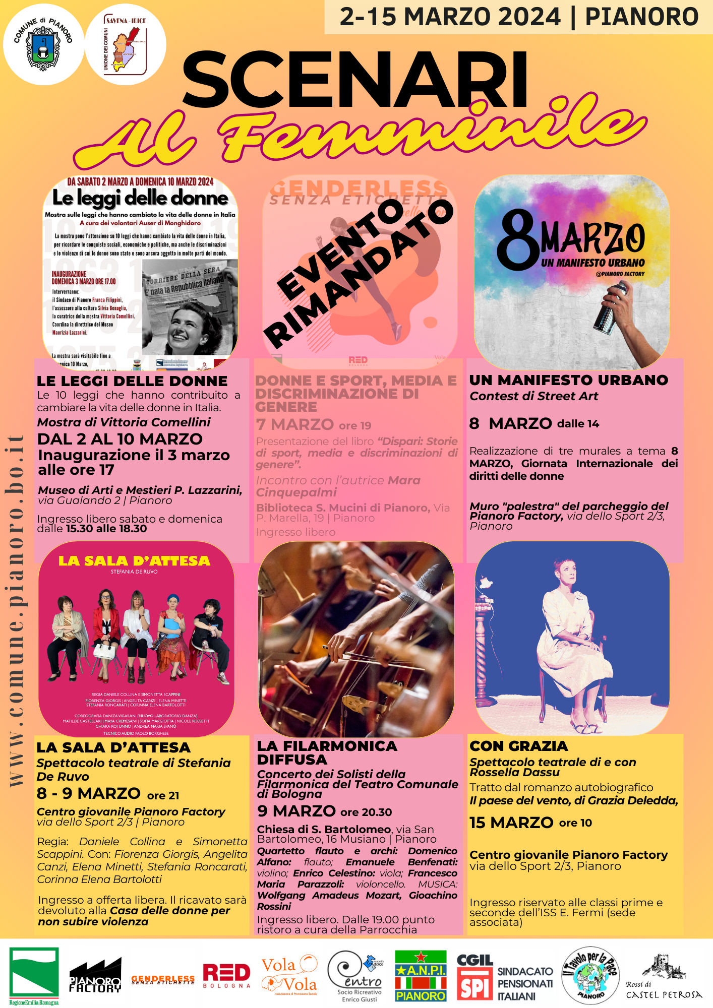 Anche quest'anno il Comune di Pianoro vuole celebrare al meglio questa giornata proponendo un programma ricco di attività che rientrano nella rassegna: "Scenari al Femminile", organizzata in collaborazione con l'Unione dei Comuni Savena-Idice, Centro socio culturale E. Giusti e le associazioni: Anpi Pianoro, Rossi di Castel Petrosa, Cgil Spi, Tavolo per la Pace, Vola Vola Aps, Red Bologna.